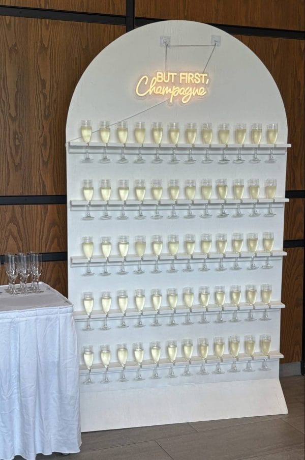 Conçu pour exposer vos coupes de champagne de façon élégante, ce mur devient rapidement le point photo favori de vos invités.